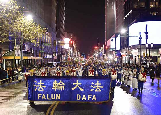 12月3日晚在美国费城的市中心举办了大游行,庆祝圣诞节、中国新年等多个传统节日。由法轮功学员组成的天国乐团和腰鼓队前来参加。