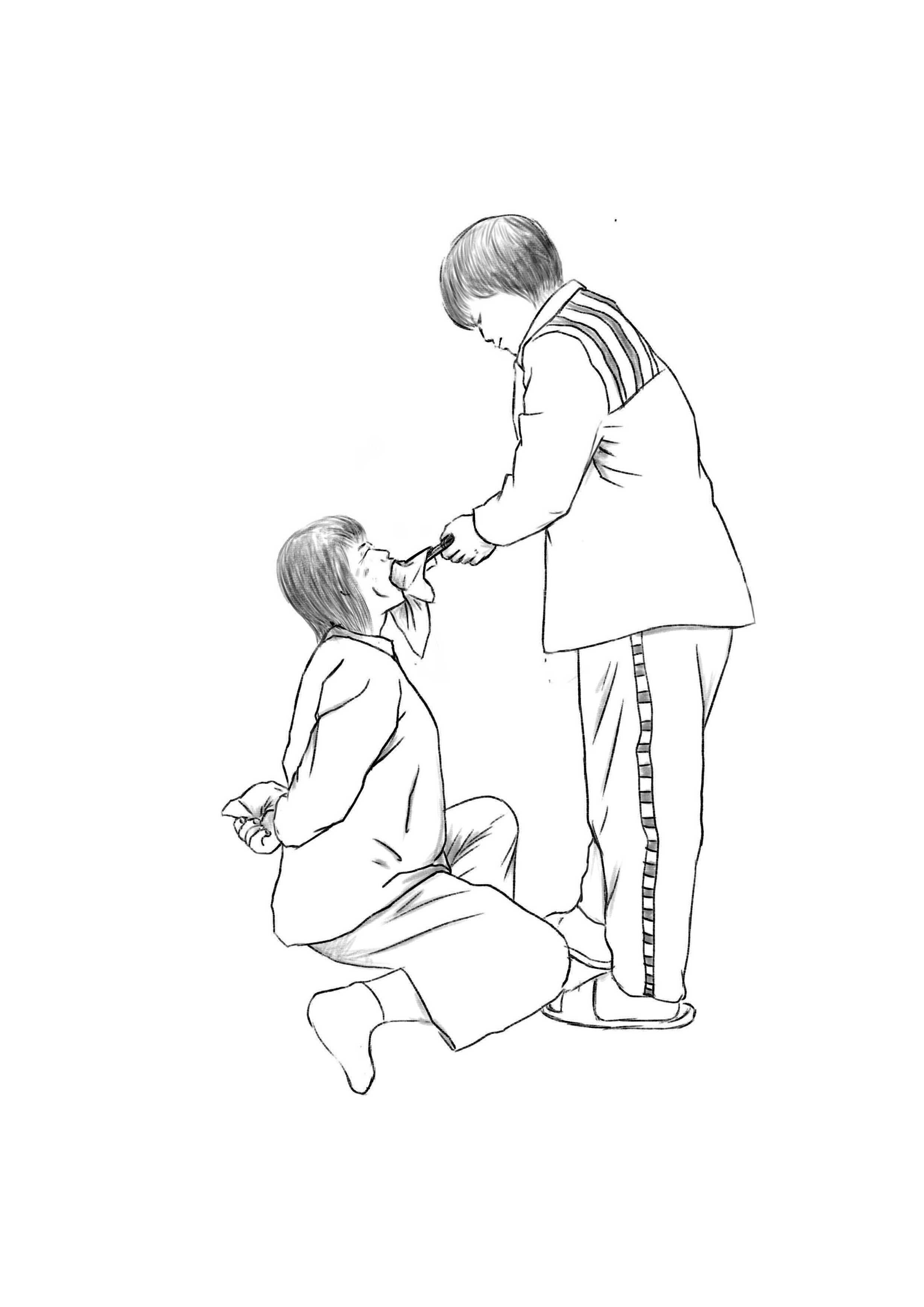 ![]() 酷刑示意图一:用鞋刷捣抹布堵嘴。 |