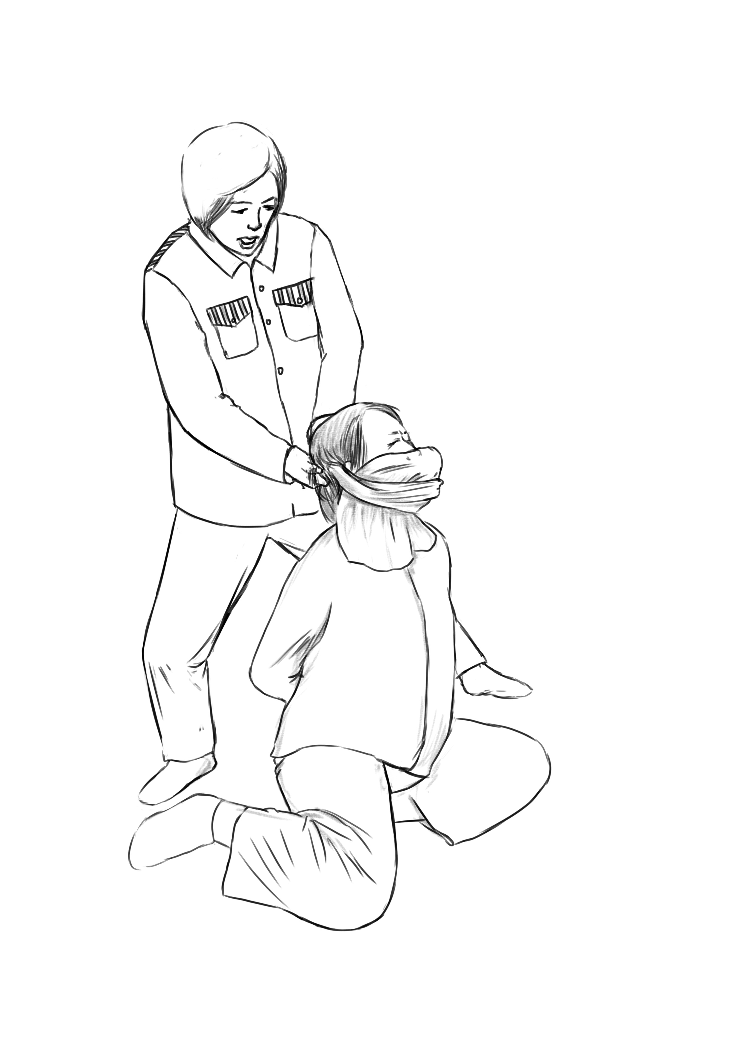 ![]() 酷刑示意图二:用抹布堵嘴,用毛巾把口蒙住,再用毛巾左右使劲拧头。 |