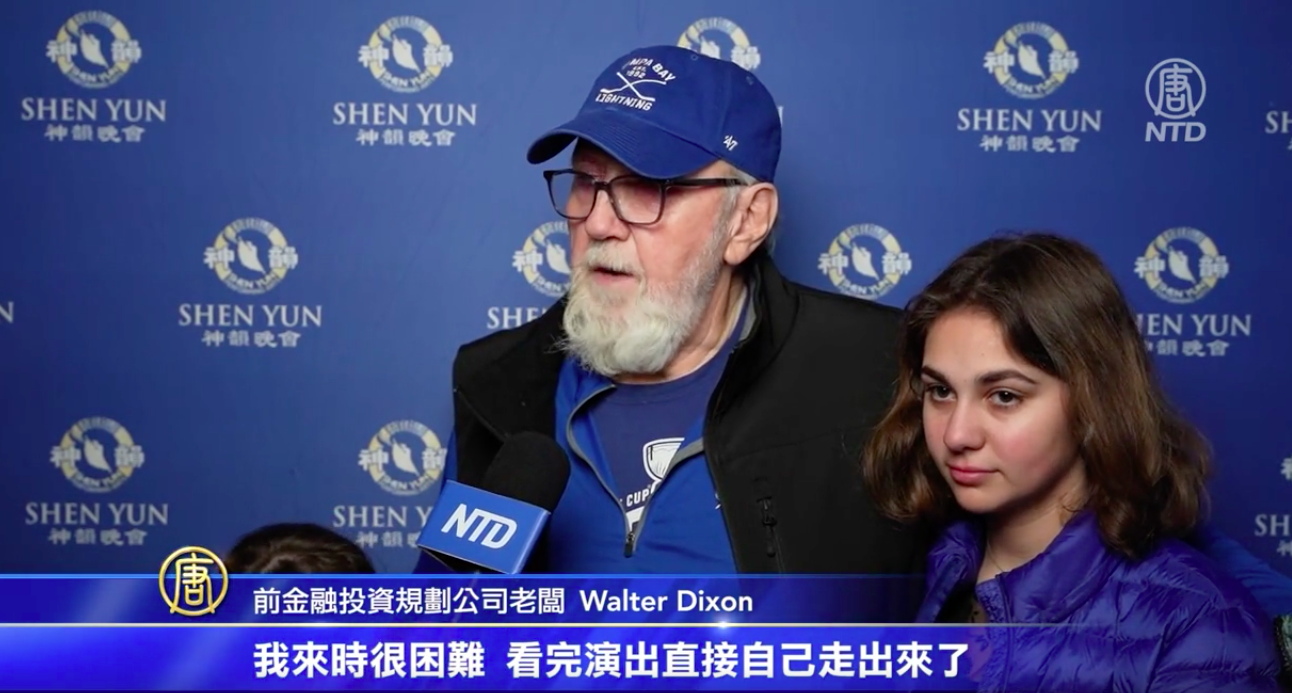 '图6:帕金森症患者沃尔特⋅迪克逊(Walter Dixon)看完神韵演出后,说:“整场演出真的具有治愈力;也让我感到平静。”(新唐人电视截图)'