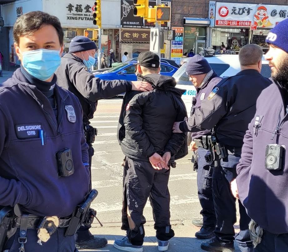 ![]() 图1:二零二二年二月十五日,警方在纽约法拉盛逮捕了袭击法轮功真相资料摊的郑步秋。(由法轮功学员提供) |