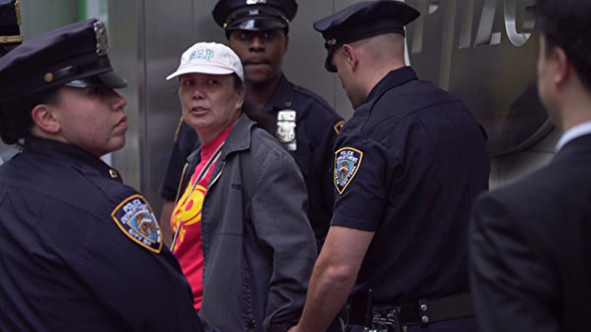 ![]() 图3:二零一六年五月十三日,李华红(左二,带白帽者)因为干扰法轮功的活动被纽约警察当场拘捕。(大纪元) |