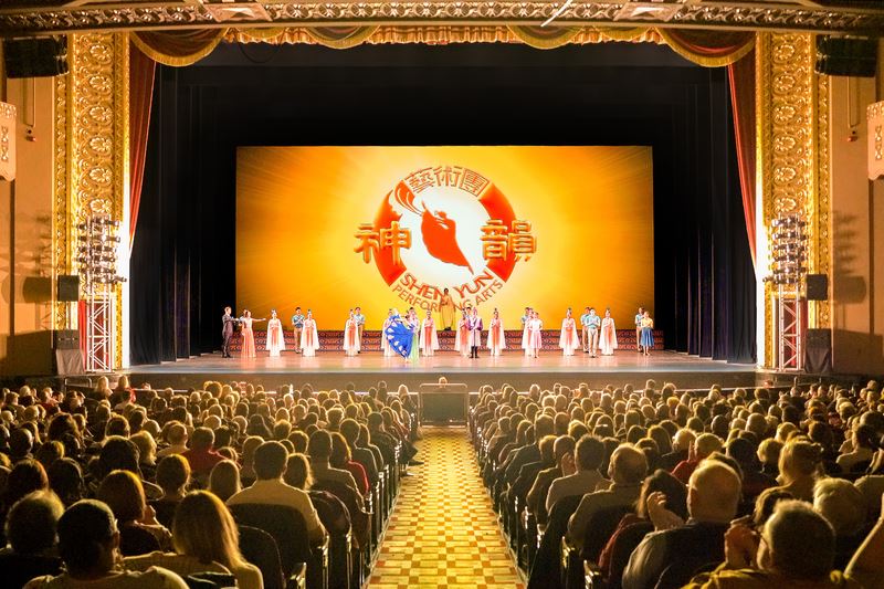 '图2:二零二二年二月十九日和二十日下午,神韵国际艺术团莅临圣路易斯的斯迪弗剧院(Stifel Theatre (Formerly Peabody Opera House)上演了二场演出。图为二十日演出的谢幕照。(大纪元)'