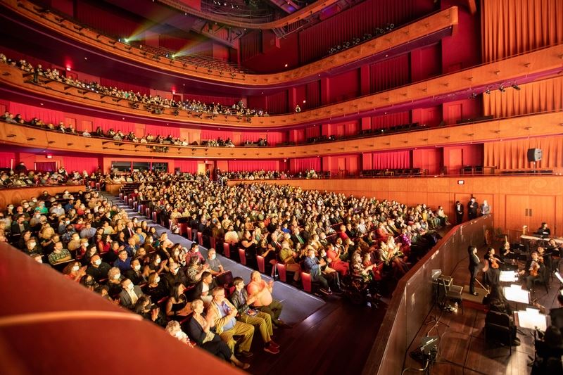 图4:二零二二年二月十八日至二十日,神韵新纪元艺术团在德州圣安东尼奥特宾表演艺术中心(Tobin Center for the Performing Arts)上演了五场演出,票房均爆满。图为二十日最后一场演出的谢幕照。(新唐人电视台)