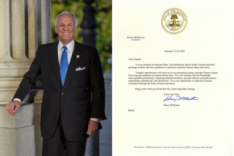 二零二二年二月十五日和十六日,神韵艺术团莅临美国南卡罗来纳州的州府和最大城市——哥伦比亚的寇格艺术中心(Columbia Koger Center for the Arts)巡回演出。南卡州州长亨利·麦克马斯特(Henry McMaster)日前发来贺信,祝贺神韵演出成功,并赞扬神韵艺术家给南卡人民带来中华传统文化盛宴。