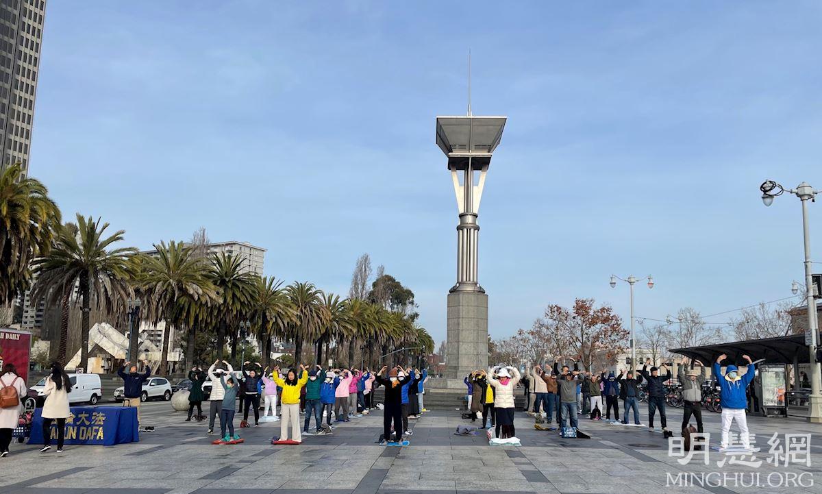 正值中国新年期间,二零二二年二月五日是大年初五,旧金山法轮功学员再次来到了渡轮大厦前的广场上,伴着祥和的炼功音乐,展示了法轮功的优美的五套功法。