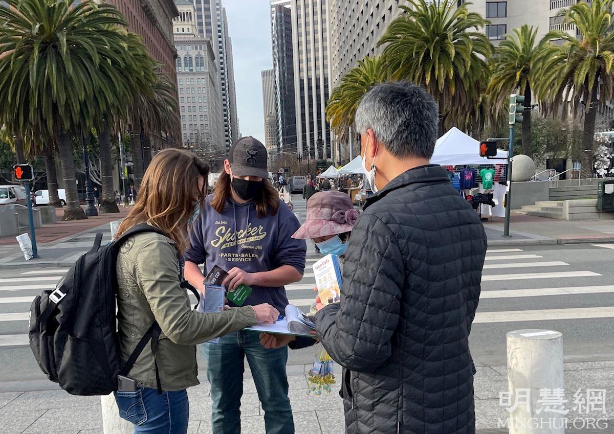 每个月的第一个周六,旧金山的法轮功学员都会来到这里集体炼功洪法、征签,每次都会吸引很多人驻足观看,有的想学功,有的认清了中共迫害法轮功的邪恶,纷纷在征签表上签名,表示支持法轮功、谴责中共的恶行。