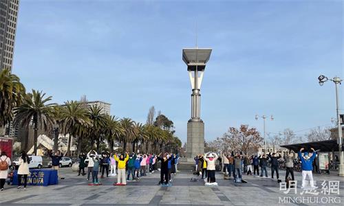 每个月的第一个周六,旧金山的法轮功学员都会来到这里集体炼功洪法、征签,每次都会吸引很多人驻足观看,有的想学功,有的认清了中共迫害法轮功的邪恶,纷纷在征签表上签名,表示支持法轮功、谴责中共的恶行。