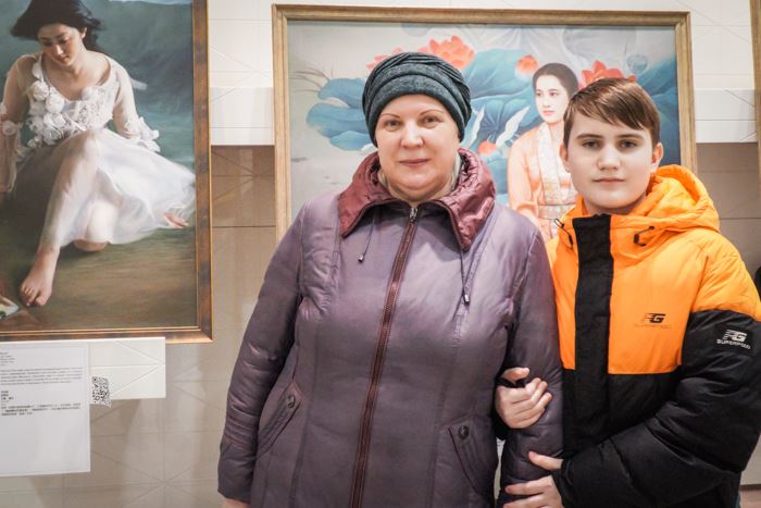 ![]() 图4:娜杰日达和她的孙子蒂莫菲观看画展后表示,从美展的画作中,能感受到真、善、忍的能量。 |