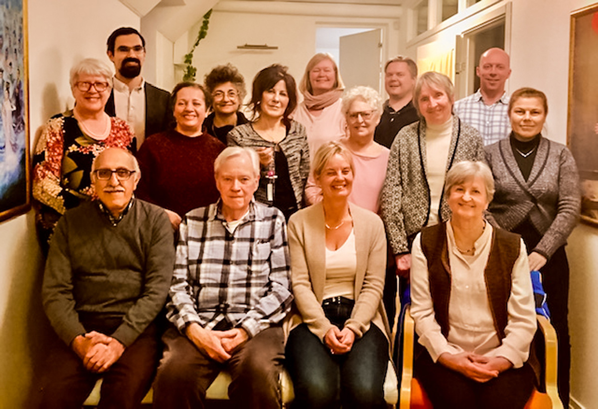 图2:在二零二零年二月珍妮特(第三排左2)有幸参加了观看法轮功创始人李洪志大师的九讲录像班,结束时她与其他部分新老学员合影留念。