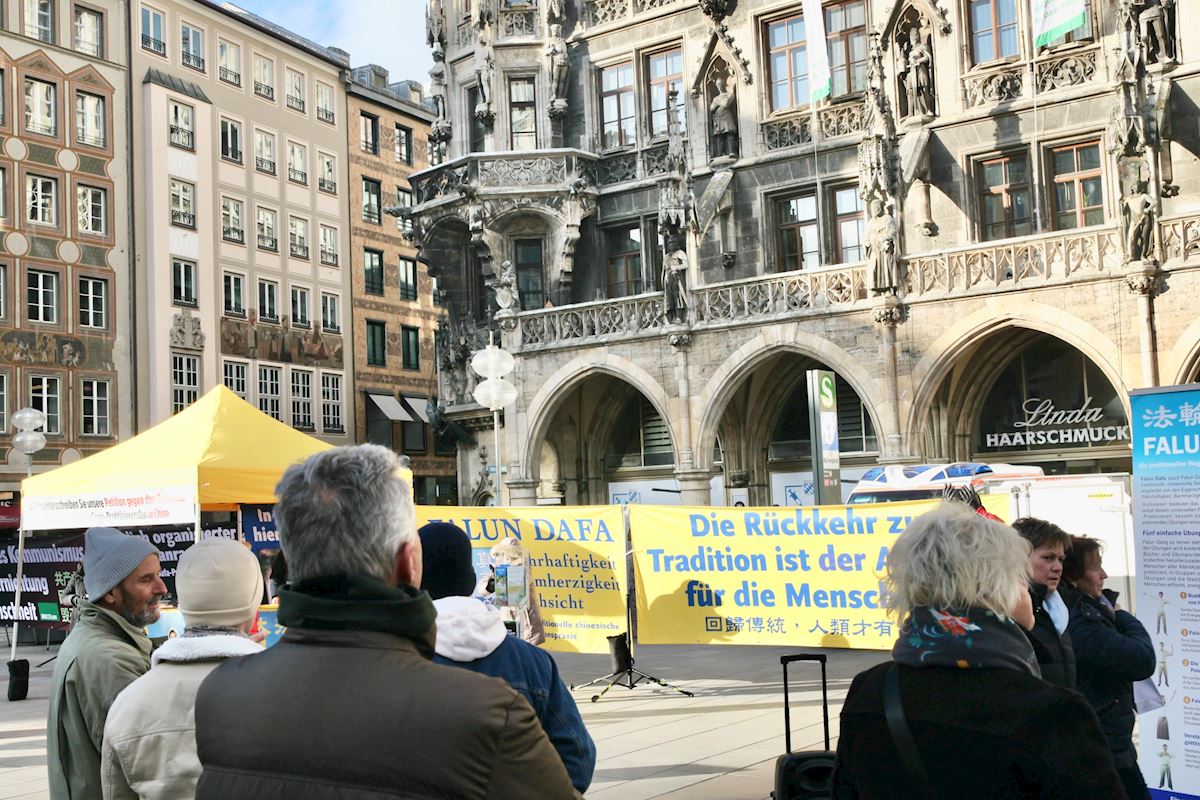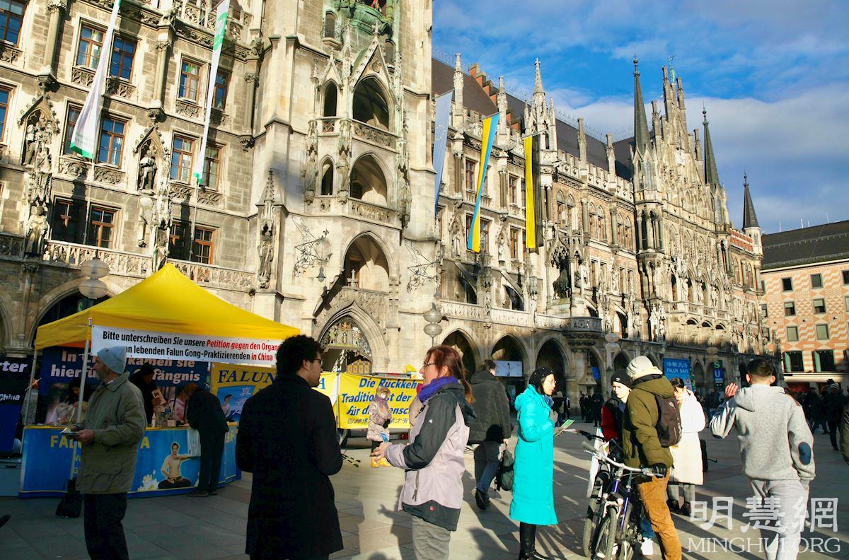 图1:二零二二年二月二十六日,法轮功学员在德国南部最大城市慕尼黑市中心玛丽亚广场举办活动。