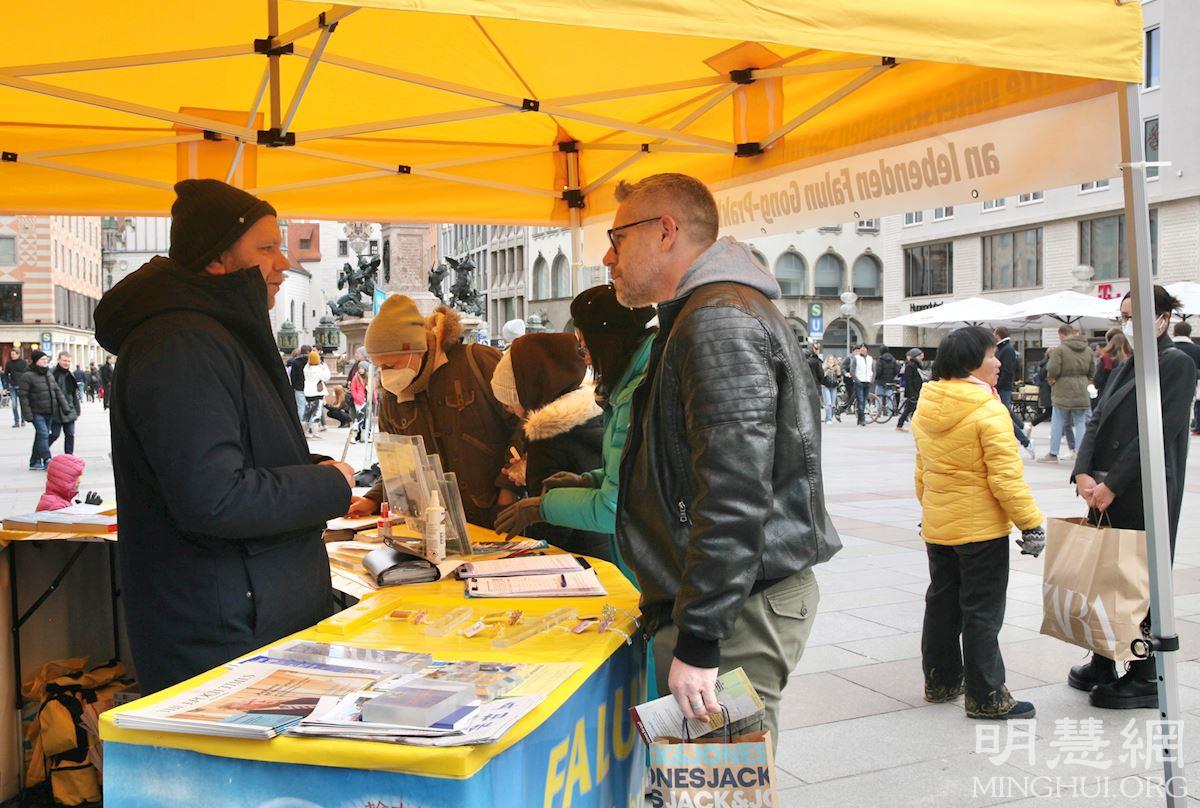 【明慧网二零二二年三月三日】(明慧记者德祥德国慕尼黑报道)二零二二年二月二十六日,法轮功学员在德国南部最大城市慕尼黑市中心玛丽亚广场举办活动,向民众展示法轮功的美好,揭露中共对法轮功迫害以及活体摘取法轮功学员器官的罪恶。不少民众在了解了真相之后,纷纷签名声援法轮功学员反迫害。