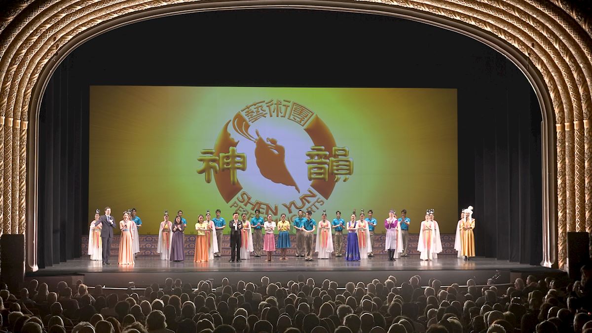 图4:二零二二年三月五日至六日神韵国际艺术团在美国哥伦布市的俄亥俄剧院(Ohio Theatre)演出两场。在雷鸣般的掌声中演员两次谢幕。图为三月六日演出谢幕照。(大纪元)
