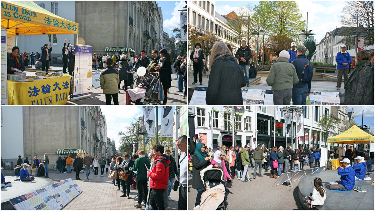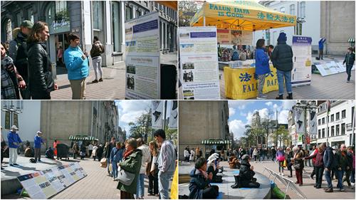 ![]() 图1~3:二零二二年四月九日,比利时法轮功学员在安特卫普市中心举办讲真相活动,许多人驻足观看、了解。 |
