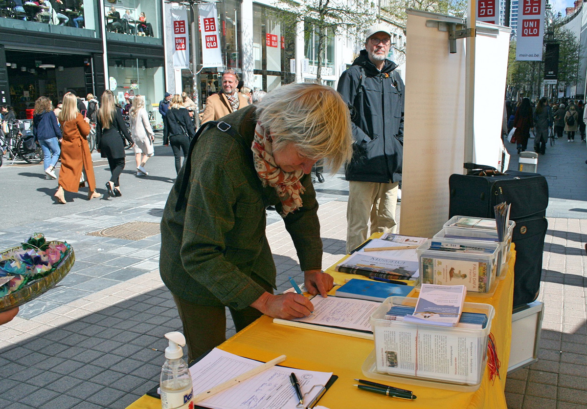 苏珊娜·斯莱格斯 (Suazzane Slegers)与她的先生站在法轮功展板前一边阅读一边谈论着,随后,她走向展桌,在停止迫害法轮功证签薄上签名。她表示,她对在中国发生的事有所了解,也知道中共对人民进行谎言欺骗。最后她祝法轮功学员的活动成功。