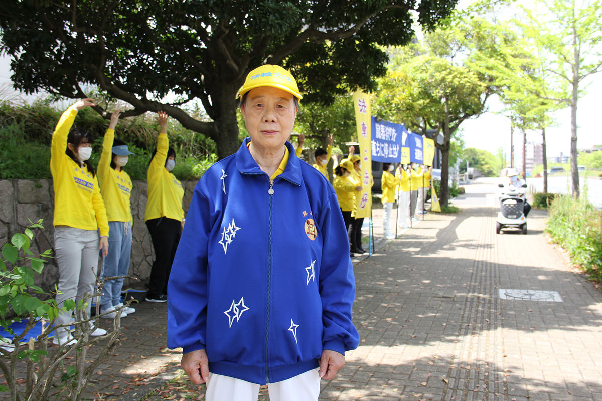 今年八十一岁的王雪梅阿姨一九九六年在国内开始修炼法轮功。二零零二年出国来到福冈后,五年间是在街上发真相资料。二零零七年,王阿姨开始在中领馆前讲真相,那时她家离中领馆特别远,每天还要搬运真相展板、横幅、资料等,很辛苦。