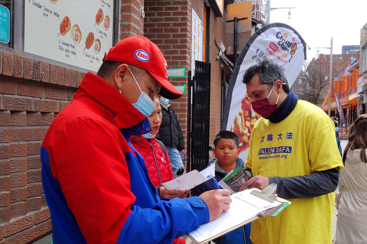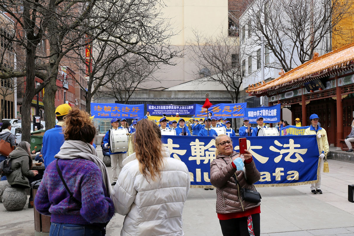 图4~6:二零二二年四月二十四日,加拿大魁北克部分法轮功学员在蒙特利尔唐人街,集会纪念“四·二五”和平上访二十三周年。民众前来了解真相。 |