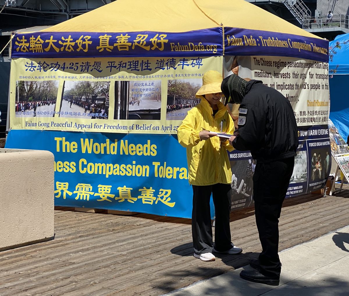 当天的巴博亚公园(Balboa Park)和中途岛航母博物馆(USS Midway)景点游人如织。“法轮功4.25请愿 和平理性 道德丰碑”、“法轮大法好 真善忍好”、“中共对法轮功的迫害手段正在伤害所有人”和“制止中共活摘器官”等横幅和图片吸引了不少人驻足观看。
