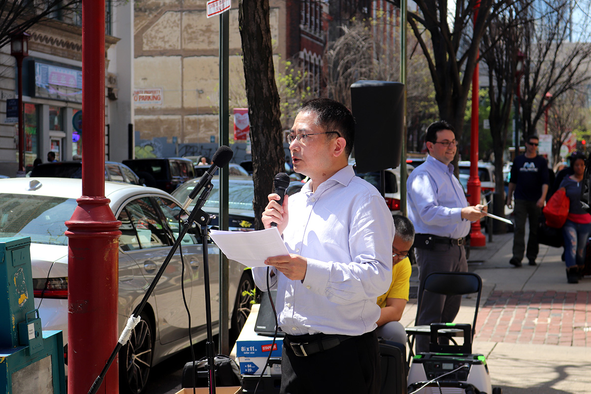 大费城法轮大法佛学会会长杨景端医生在集会上表示:“四·二五”就是法轮功学员在用行动实践真、善、忍。