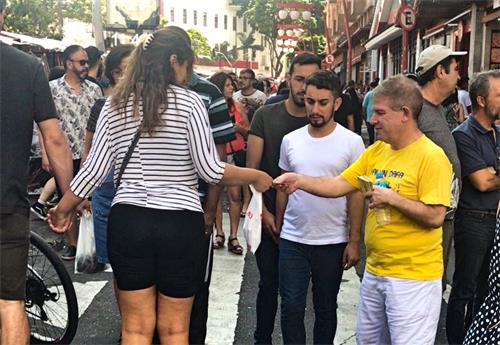 当天天气晴朗,因节日关系,东方区热闹非凡,到处熙熙攘攘,学员们手里拿着葡语传单和中文明慧报纸,看到巴西人给传单,看到中国人给中文报纸、讲真相,忙的不亦乐乎。因为人太多,有时传单都来不及发,抓在手里的传单一下子很快就发完了,赶紧又从包里拿取。