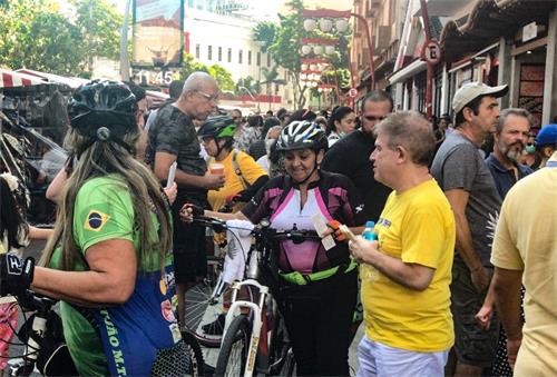 有位巴西女士看到法轮功学员非常地喜悦和激动,她说不止一次看到你们了,以前在商场参观了真、善、忍美展很感动。她向学员展示了包里收藏的有介绍法轮功的书签,她说,法轮功真是一个神奇的功法。并说,似乎在哪儿都能看到你们。