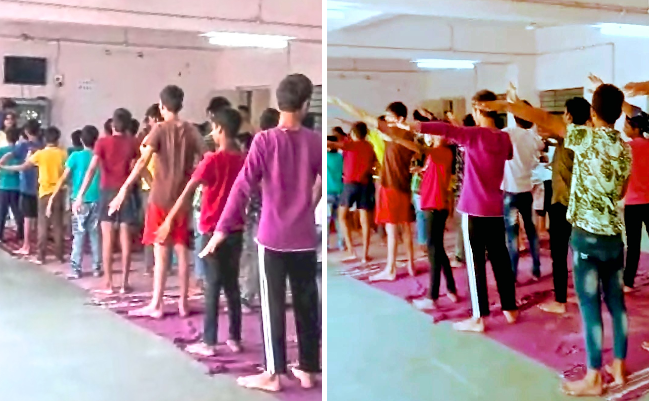 随后,学生们整齐的列队,开始学炼法轮功功法。哈乐夏在正面演示功法教功,她的儿子斯巴喜(Sparsh)站到窗口附近的长凳子上同时从侧面演示。因为时间有限,学生们只学炼了第一套与第五套功法。结束时,大多数学生都表示学炼时感到平静祥和。并告诉哈乐夏:他们愿意学炼法轮功功法,希望能在周末学,因为他们周末才会有空。