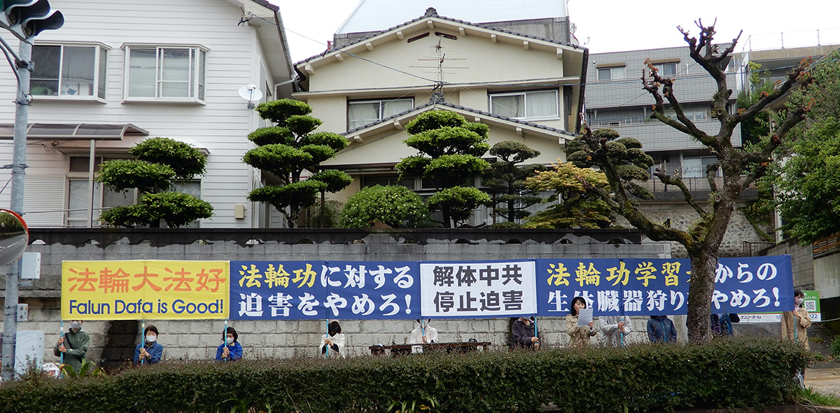 二零二二年四月二十三日,纪念“四·二五”二十三周年,日本熊本地区法轮功学员上午聚集在福冈中领馆前,下午在长崎中领馆前打开横幅和真相展板,以及宣读中文和日文的文声文的方式,谴责中共对法轮功学员的迫害,并呼吁日本共同制止中共恶行维护人权和和平。