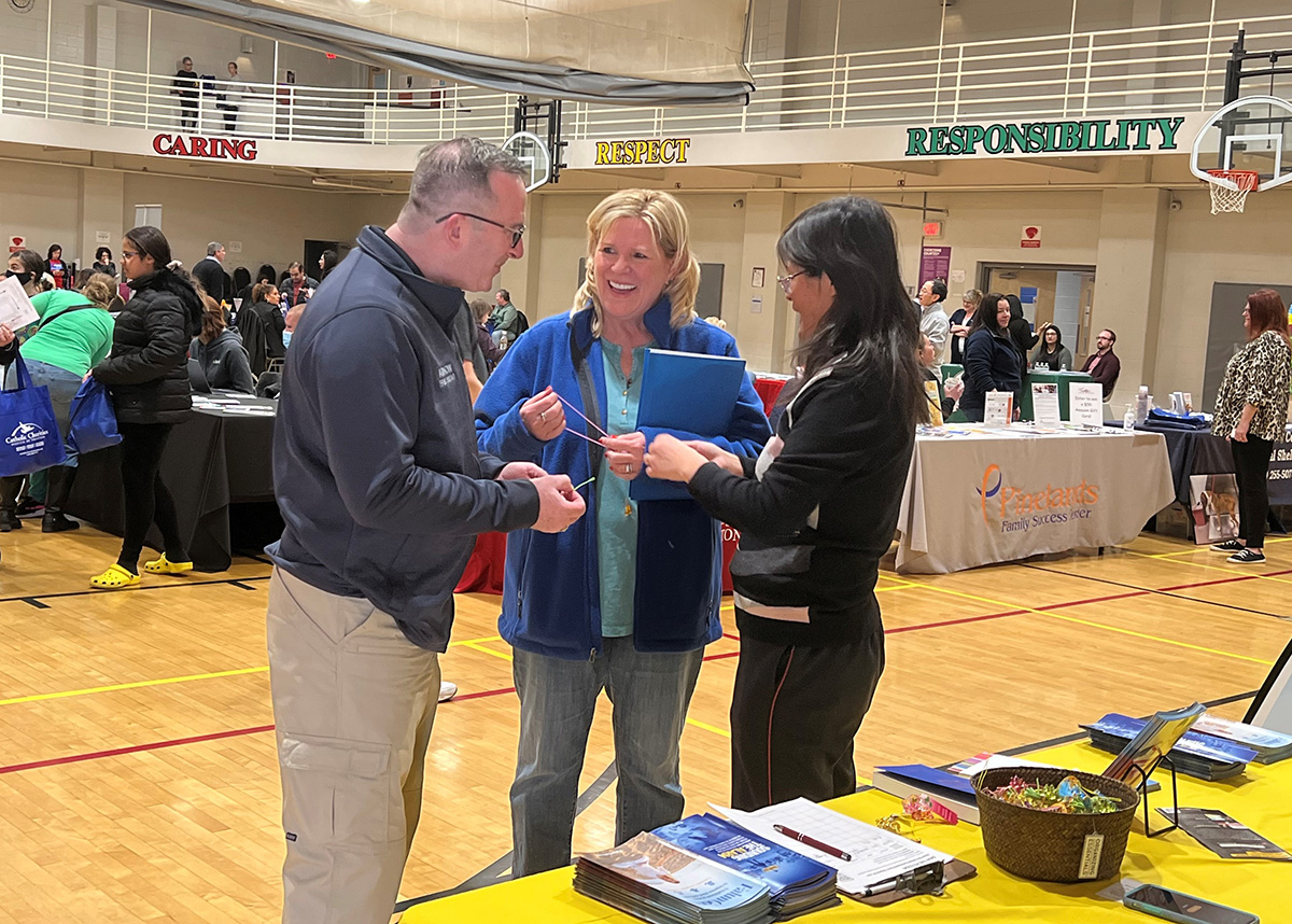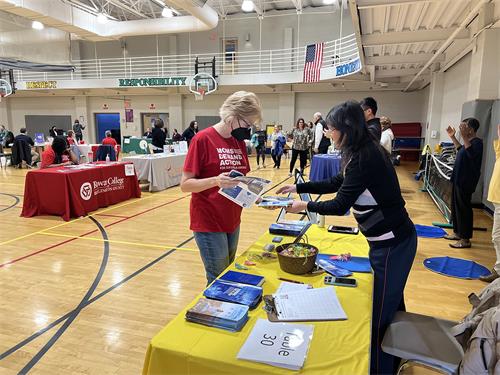 ![]() 图3:新泽西州州众议员卡罗尔·墨菲(Carol Murphy)(中)拜访法轮功展位,并接受法轮功学员赠送的功法传单和精美小莲花。(法轮功学员提供) |