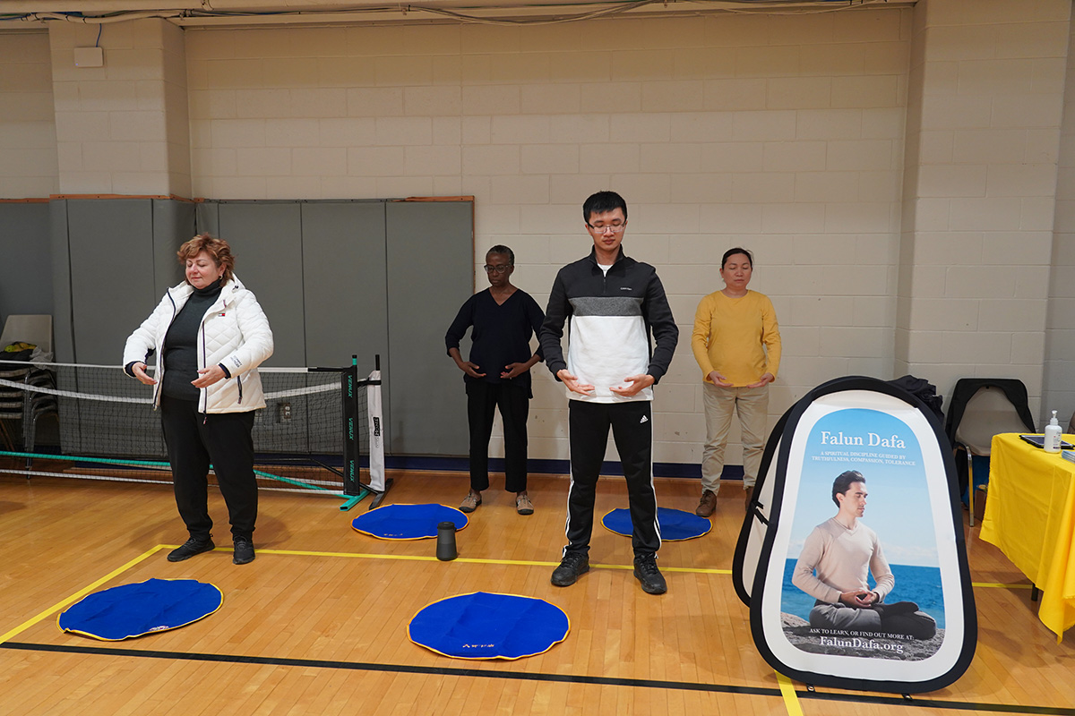 ![]() 图4:法轮功学员在展位旁做功法演示,并提供免费教功。(法轮功学员提供) |