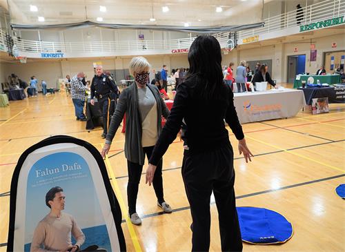 法轮功学员在展位旁做功法演示和教功,不少人被优美舒展的炼功动作所吸引,到展位前咨询,有的人还当场学炼法轮功。