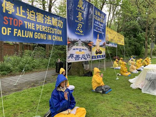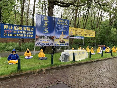 四月的荷兰正是鲜花盛开的季节,当日,天空飘起小雨。荷兰法轮功学员冒雨赶到位于海牙的中使馆,以和平的方式抗议中共非法迫害法轮功。
