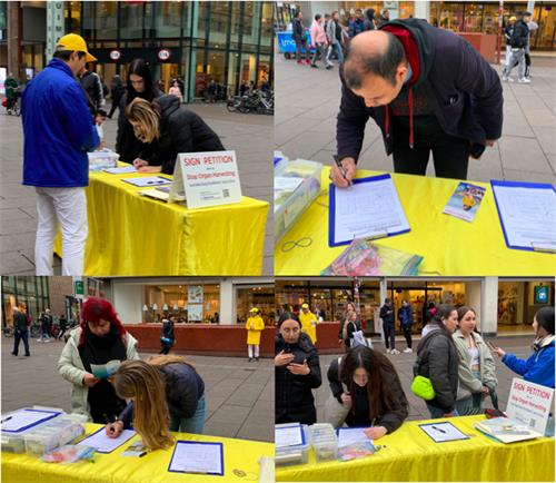 当日下午,部分法轮功学员来到海牙最繁华的市中心,进行弘法活动。向民众发传单、讲真相,征集制止中共活摘法轮功器官的签名。