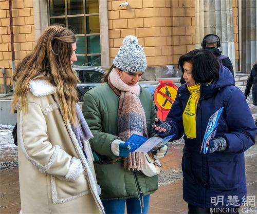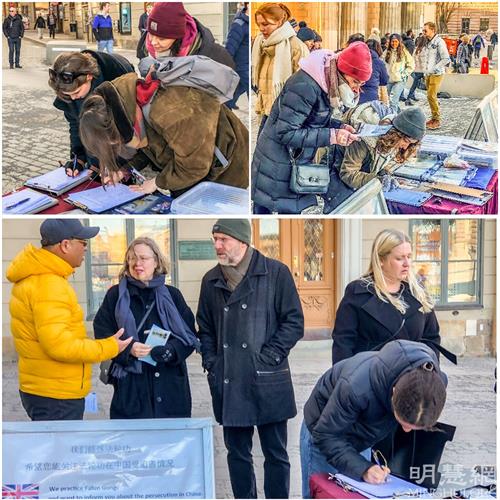 三月五日下午,来自拉托维亚的一位中年女士,走过来二话不说拿起笔就签了字。学员问她是否了解法轮功?“我知道这个功法非常好。”她告诉学员:“我也知道中共在活摘法轮功学员器官,我很愿意帮助制止迫害,这个字必须要签。”