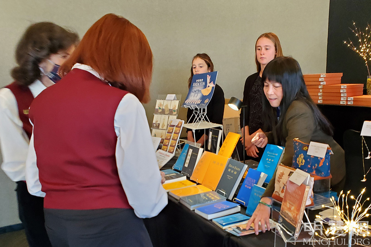 在礼品柜台工作的陈女士说,当她知道要在神韵演出的剧院出售法轮大法书籍后,她的脑中就闪出一个意念:买书的人要来了。有缘的人要来找大法了。她表示,演出开始前,就已经有四、五个观众购买了《转法轮》。