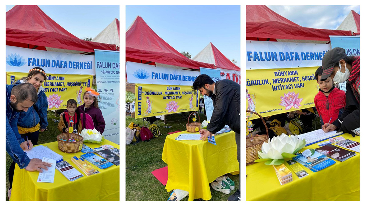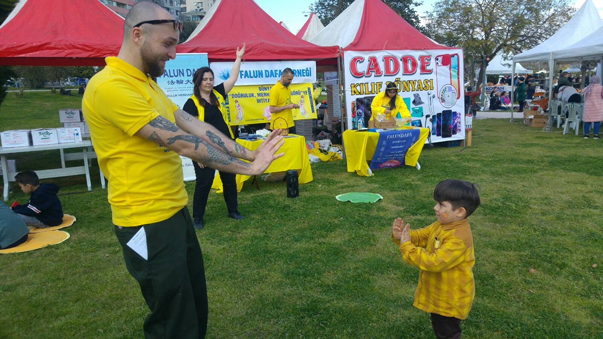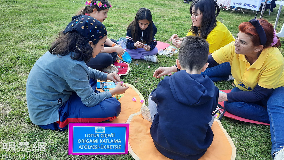 法轮功学员还在默克兹公园(Merkez Park)设立了摊位。许多人来到摊位,跟法轮功学员学功。法轮功学员还举办了免费的折纸莲花工作坊。许多孩子来学习做莲花。
