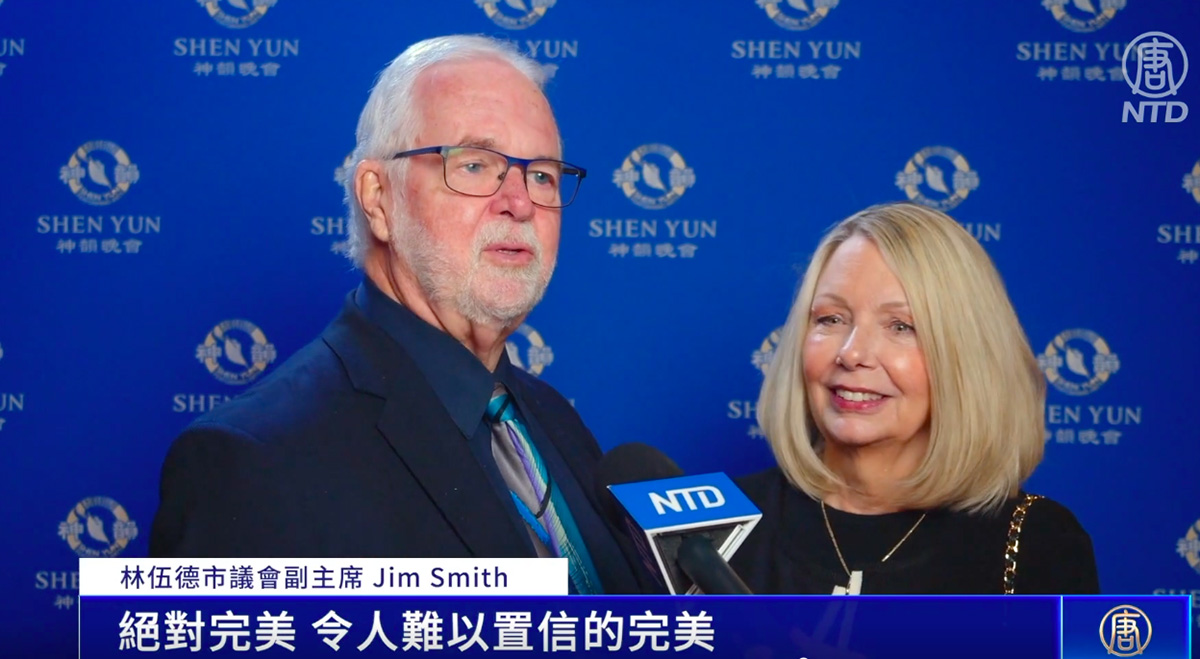 图6:这是林伍德市议会副主席吉姆•史密斯(Jim Smith)先生与太太第二次观赏神韵演出。他说:“整场演出从头到尾,一遍又一遍地重现(神传文化)这个主题。我们太喜欢了,绝对喜欢!”(新唐人电视截图)