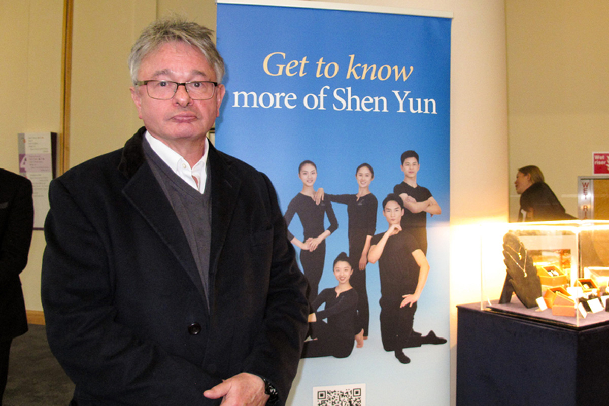 图9:二零二二年三月三十一日,英王室属地泽西岛资深律师、Sinel & Co创始合伙人菲利普·西内尔(Philip Sinel)第三度观赏了神韵演出。(大纪元)