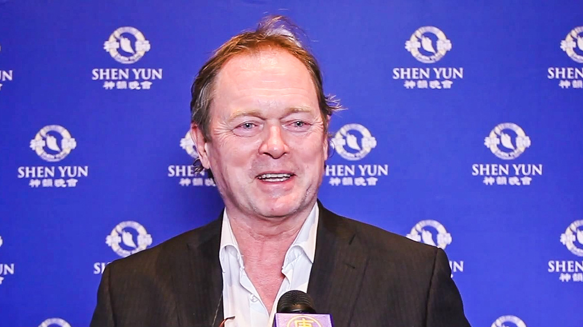 图8:英国王室管家劳伦斯·麦肯纳(Lawrence McKenn)观看了神韵纽约艺术团在英国伯明翰ICC剧院的演出后,表示,神韵演出精彩绝伦。(新唐人电视截图)