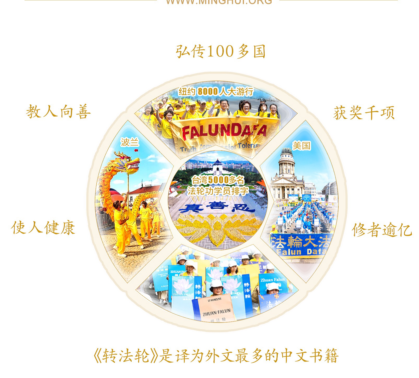 1、法轮功也称法轮大法,是佛家上乘修炼大法,以真、善、忍为根本指导,包含五套舒缓优美的功法,使人道德升华,身心健康。一九九九年七月二十日当年迫害法轮功时江泽民喊出三个月要消灭法轮功 。如今对法轮功迫害超过了二十二年,不但没有倒下,反而更加宏伟壮大,现已弘传世界一百多个国家和地区,荣获各类褒奖3600多项,受到世界人民爱戴和尊敬。主要著作《转法轮》被翻译成四十多种语言文字出版,是汉语书籍被译成外国语种最多的书籍。法轮佛法弘传全球,福益世界,好评如潮!