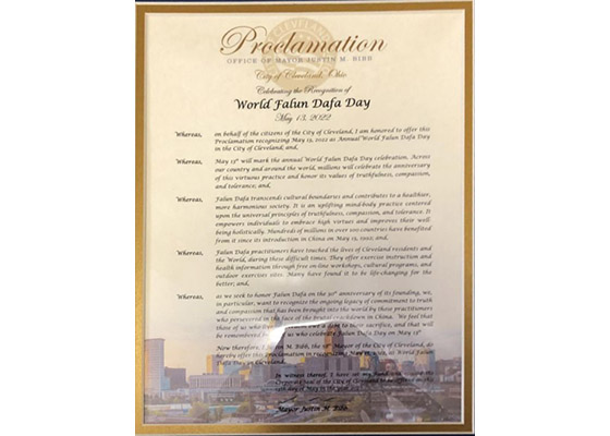 美国俄亥俄州克利夫兰市市长贾斯汀·比布五月十三日颁发褒奖,宣布五月十三日为克利夫兰市世界法轮大法日。
