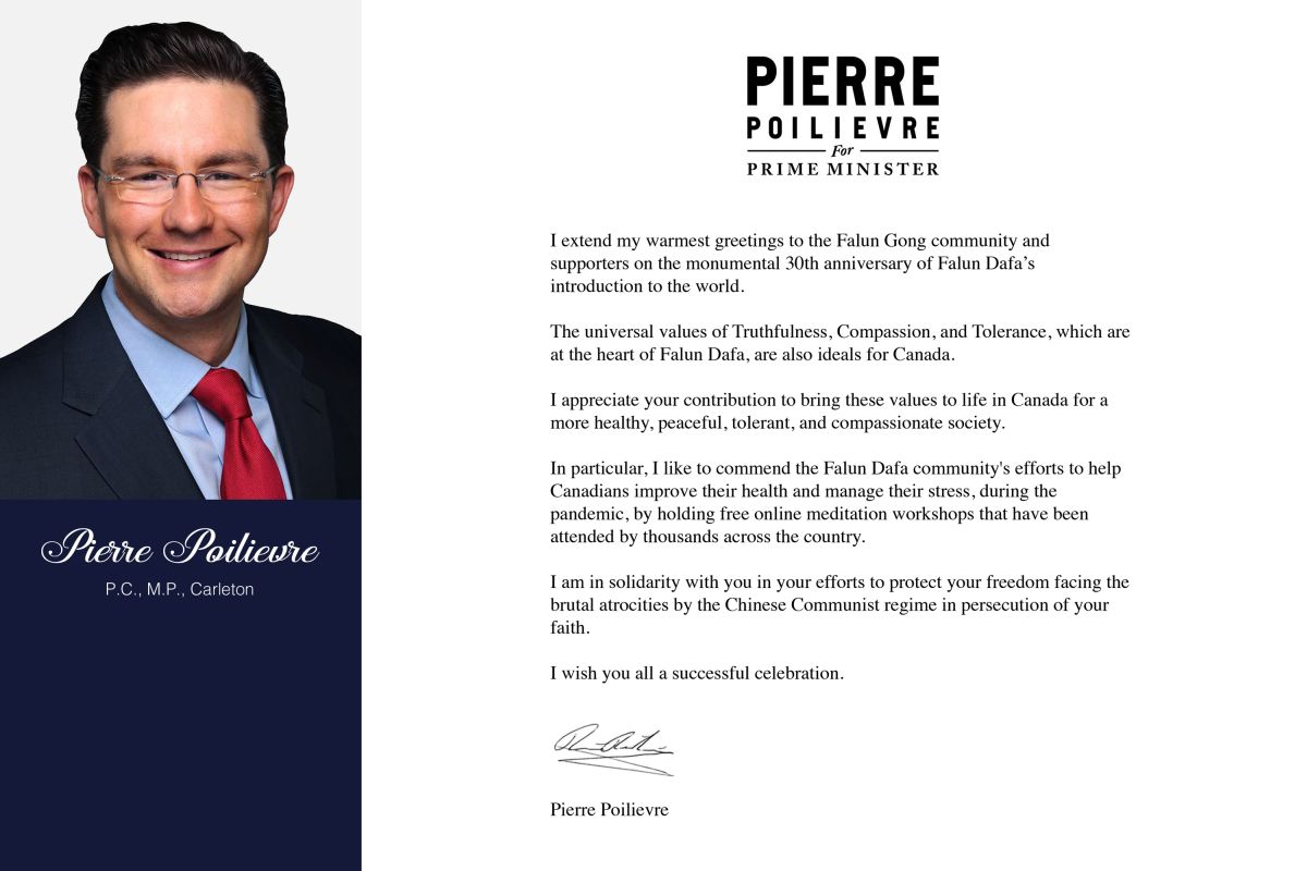 图2:法轮大法传世三十周年之际,总理和保守党党领候选人、保守党影子内阁财政部长、卡尔顿(Carleton)选区国会议员皮埃尔·鲍利夫(Pierre Poilievre)发来贺信向“法轮功学员和支持者致以最热烈的问候。”