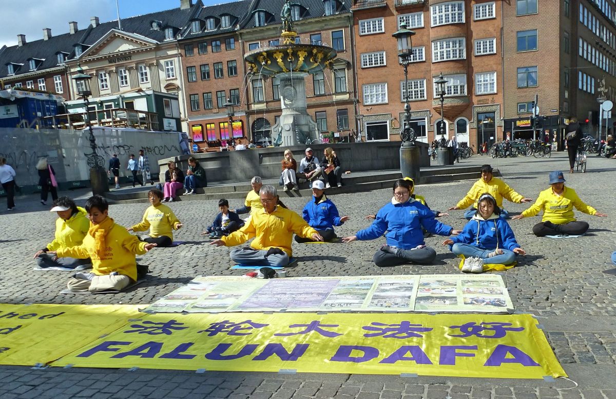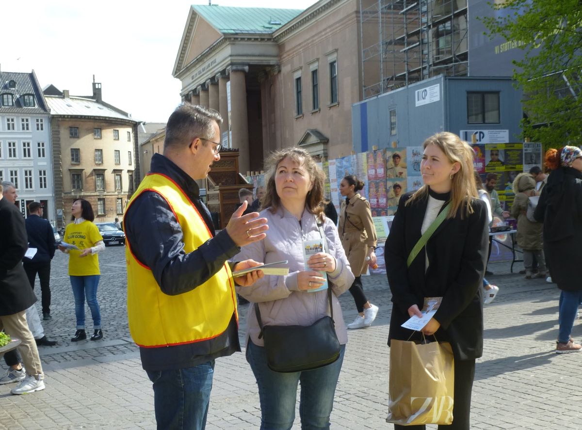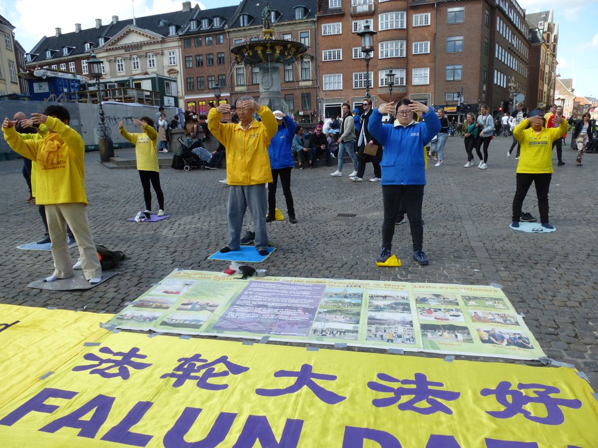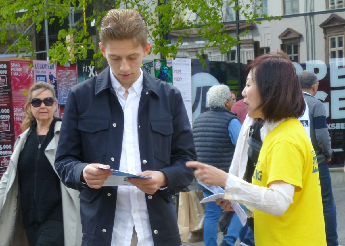 丹麦与瑞典的法轮功学员们与往常一样,自动的在市中心的老广场,铺开了横幅,放起了炼功音乐。一些学员在展示功法,另一些学员面带微笑向人们热情的打招呼,向穿梭不停的行人递上介绍法轮大法的传单。不少人看到了闹市中这安详、宁静的一隅,不由得停下了脚步,好奇地询问什么是法轮功。学员们热心而详尽给他们介绍与解释。有的行人驻足与学员长时间交谈。有的拿着法轮大法的真相传单说:“我肯定会去花时间去你们的网页上了解法轮功的!因为我感到非常有意思!“