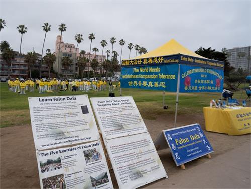 '图4:二零二二年五月七日,圣地亚哥学员在拉荷雅(La Jolla)海边洪法讲真相,“真善忍美展”的画作吸引游人驻足观看。'