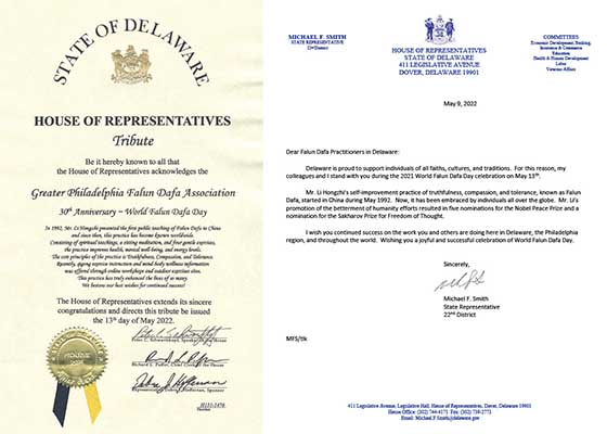 在今年世界法轮大法日即将到来之际,美国德拉华州部分政府官员发来贺信祝贺法轮大法日。