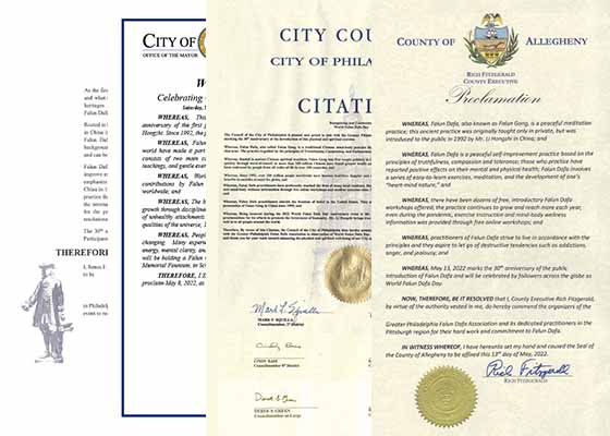 在今年世界法轮大法日即将到来之际,美国宾州费城、匹斯堡等政府官员纷纷发来贺信祝贺法轮大法日。