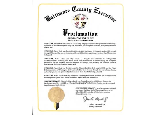 马里兰州巴尔的摩郡郡长小约翰·奥尔泽沃斯基颁发褒奖令,把二零二二年五月十三日定为巴尔的摩郡“世界法轮大法日”。