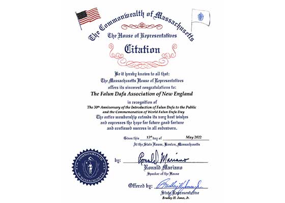 麻州众议院祝贺法轮大法弘传三十周年