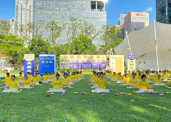 台湾大台中市地区部分法轮功学员五月八日在市政府广场上集体炼功,庆祝法轮大法弘传世界三十周年暨法轮功创始人李洪志先生华诞。