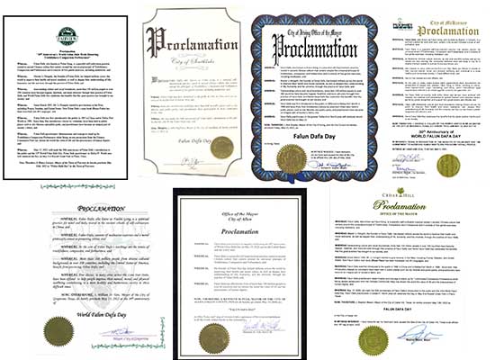 美国德克萨斯州的艾伦市、雪松山市、锦绣市、葡萄藤市、艾文市、麦肯尼市及南湖市的市长宣布5月13日为本市的法轮大法日。