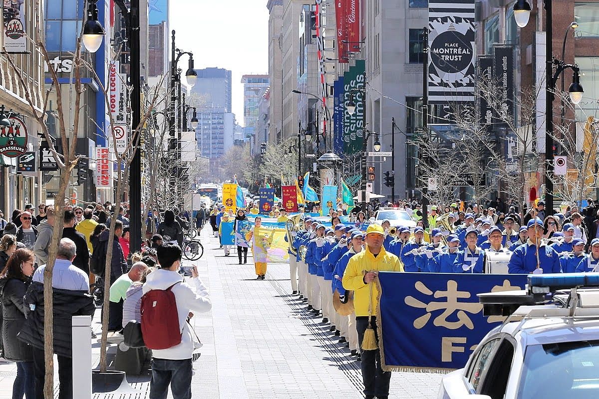 五月七日下午,来自魁省多个城市的法轮功学员,组成了天国乐团、真相横幅、功法展示、彩旗阵等几个游行方阵。下午两点,游行队伍从市中心凯博广场出发,沿着蒙特利尔最繁华的商业大道圣凯瑟琳大街行进,将大法传世、普天同庆的喜悦一路传播。在抵达终点艺术中心广场后,法轮功学员拍摄合影和录像,齐声向师父表达感恩:恭祝师父生日快乐,谢谢师父!